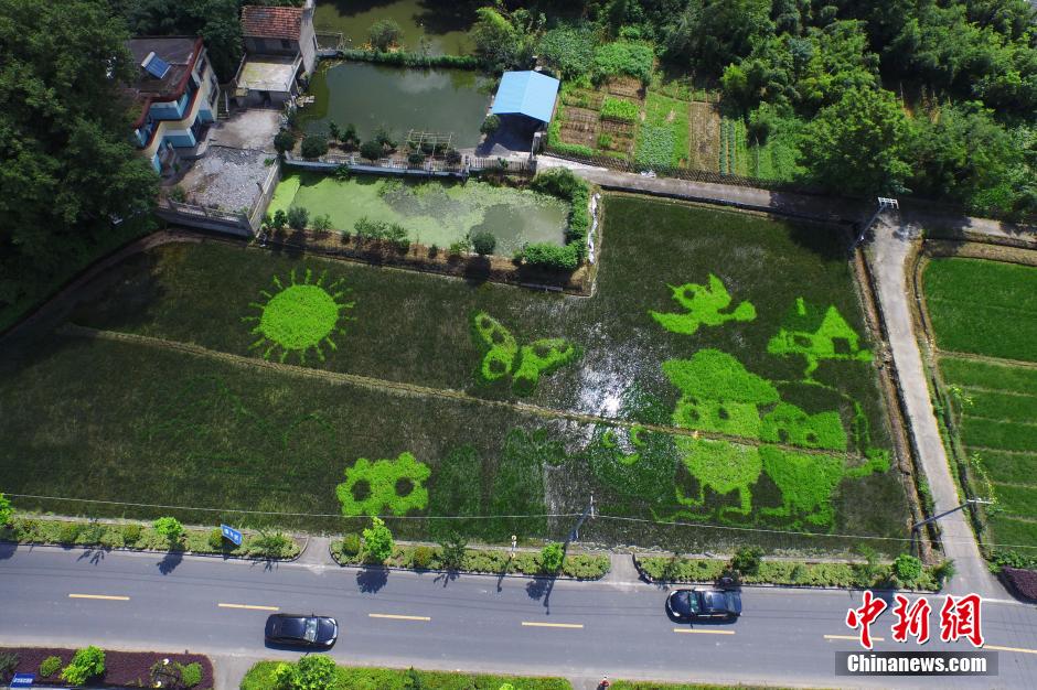 | The “2015 Rice Field Cartoon Festival” is held in the testing site of “Yuan Longping super rice” Kangyuan ecological farm in Hangzhou, east China’s Zhejiang province on July 26, 2015. The agricultural science research team of Zhejiang University created cartoon works with the world’s first four-color rice in the field, which have attracted many tourists. (CNS/Li Zhong) |