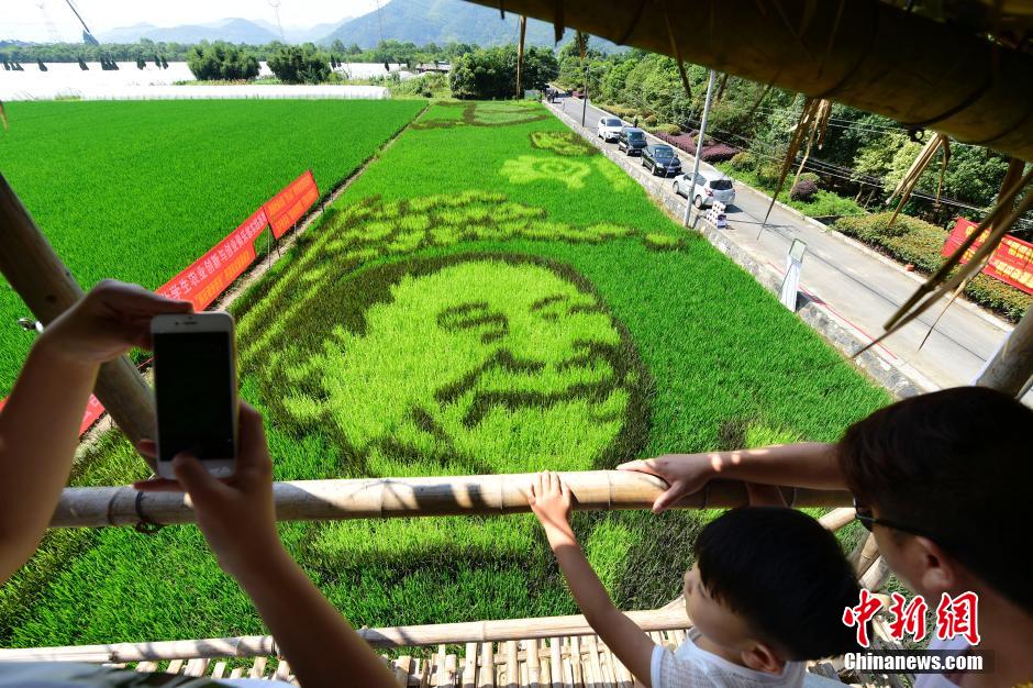 The “2015 Rice Field Cartoon Festival” is held in the testing site of “Yuan Longping super rice” Kangyuan ecological farm in Hangzhou, east China’s Zhejiang province on July 26, 2015. The agricultural science research team of Zhejiang University created cartoon works with the world’s first four-color rice in the field, which have attracted many tourists. (CNS/Li Zhong)