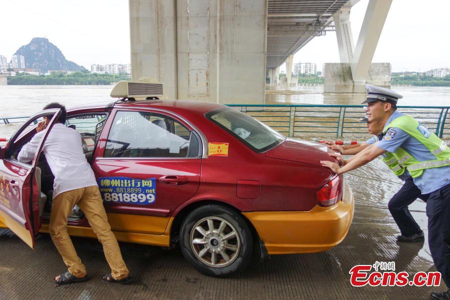 Traffic police officers help a taxi stranded on a flooded road after rainstorms in Liuzhou city, Southwest China’s Guangxi Zhuang autonomous region, July 28, 2015. Rainstorms and floods have affected 262,700 people in Guangxi and 12,700 have been evacuated to safety, a local source says. (Photo: China News Service/Huang Weiming)