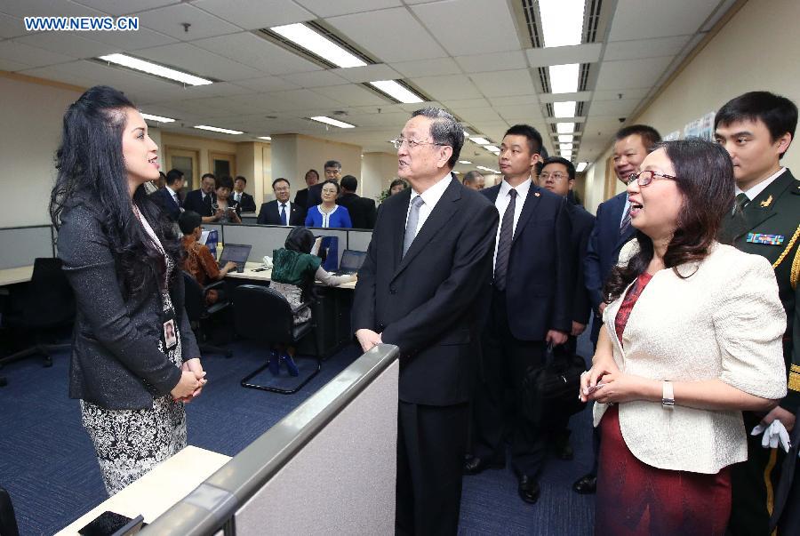 | Yu Zhengsheng (C), chairman of the National Committee of the Chinese People's Political Consultative Conference, talks with a staff member during his visit to the Indonesian subsidiary of Chinese telecom giant Huawei in Jakarta, capital of Indonesia, July 28, 2015. (Xinhua/Yao Dawei) |