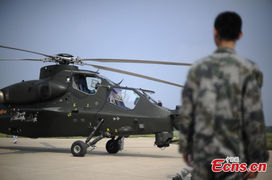 A pilot walks past a Z-10 helicopter at a base in Liaocheng, East China’s Shandong province, July 28, 2015. The "Thunder" aerobatics team is the first helicopter aerobatics team of army aviation in the Chinese People's Liberation Army (PLA). Li Kuiyuan has a safe flight record of 7,000 hours, and he is also the first in the country to turn armed helicopter somersaults. The team will stage air shows at the 3rd China (Tianjin) International Helicopter Exposition scheduled in September. (Photo: China News Service/Tong Yu)