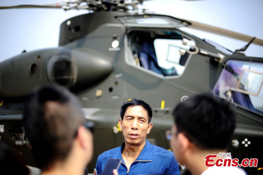 Li Kuiyuan, leader of the "Thunder" aerobatics team, introduces a Z-10 helicopter before presenting a stunt performance at a base in Liaocheng, East China’s Shandong province, July 28, 2015. The "Thunder" aerobatics team is the first helicopter aerobatics team of army aviation in the Chinese People's Liberation Army (PLA). Li has a safe flight record of 7,000 hours, and he is also the first in the country to turn armed helicopter somersaults. The team will stage air shows at the 3rd China (Tianjin) International Helicopter Exposition scheduled in September. (Photo: China News Service/Tong Yu)