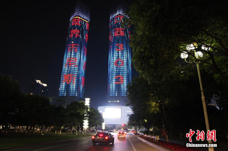 The 303-meter-high skyscraper in Nanchang, east China's Jiangxi province, sets a new Guinness record for "the world's largest LED lighting curtain" on July 28, 2015. (CNS/Wang Jian)