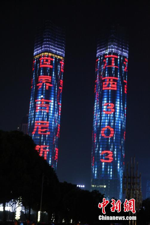 The 303-meter-high skyscraper in Nanchang, east China's Jiangxi province, sets a new Guinness record for "the world's largest LED lighting curtain" on July 28, 2015. (CNS/Wang Jian)