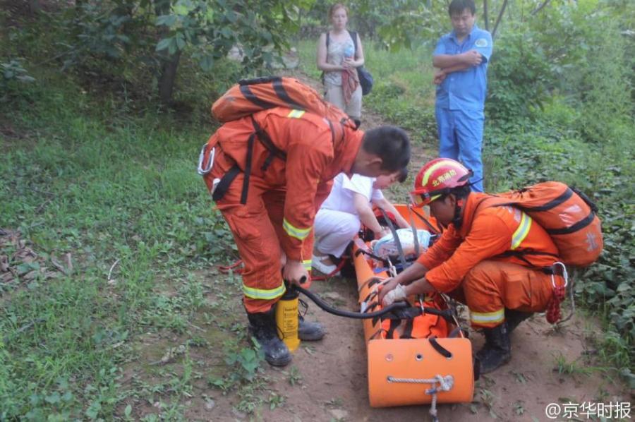 Rescuers help a South Korean tourist, injured after falling from an old, five-meter-tall watchtower on a hill in Huairou district, Beijing, July 29, 2015. Three Poland visitors found the injured woman and helped contact police for help. The South Korean tourist suffered fractures in her left arm. (Photo/Weibo of Beijing Times)