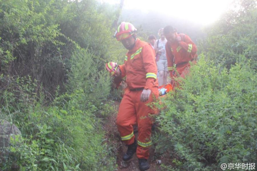 Rescuers help a South Korean tourist, injured after falling from an old, five-meter-tall watchtower on a hill in Huairou district, Beijing, July 29, 2015. Three Poland visitors found the injured woman and helped contact police for help. The South Korean tourist suffered fractures in her left arm. (Photo/Weibo of Beijing Times)