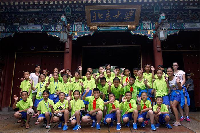 Students pose with the tour guides before the school gate of Beijing University in Beijing on July 30, 2015. [Photo by Zhu Xingxin/chinadaily.com.cn]
