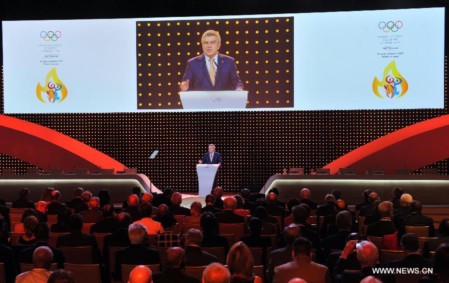 | International Olympic Committee (IOC) President Thomas Bach speaks at the 128th IOC session in Kuala Lumpur, Malaysia, on July 31, 2015. The session will decide the host cities of the 2022 Olympic Winter Games and the 2020 Youth Olympic Winter Games. (Xinhua/Gong Lei) |