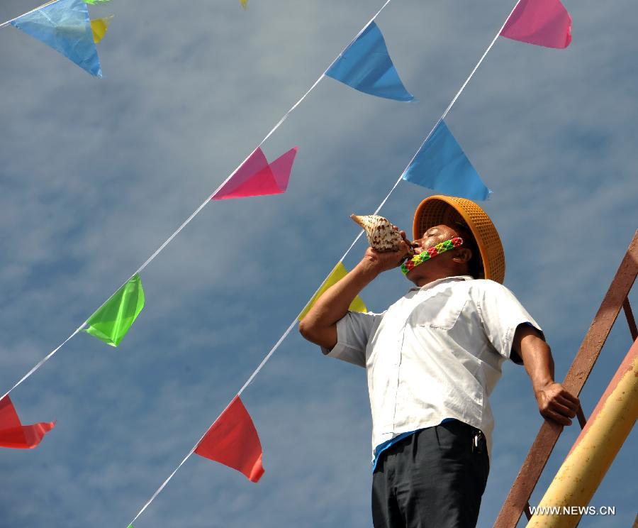 A fisherman sounds the bugle to celebrate the end of the fishing ban lasting 10 weeks in Tanmen of Qionghai, south China's Hainan Province, Aug. 1, 2015. Around 9,000 fishing boats are ready to set sail from south China's Hainan Province as a seasonal fishing ban in the South China Sea was lifted on Saturday. (Xinhua/Meng Zhongde)