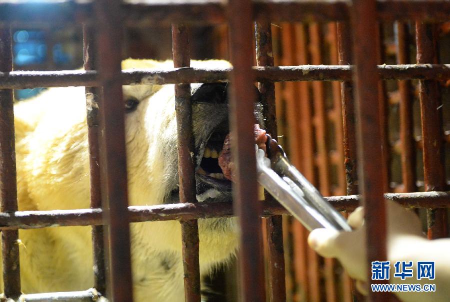 Tamer feeds the polar bear. (Xinhua/Wang Kai)