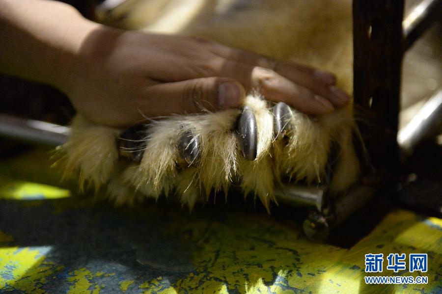 Tamer Dong touches polar bear's paw to clam him down, July 30, 2015. (Xinhua/Wang Kai)