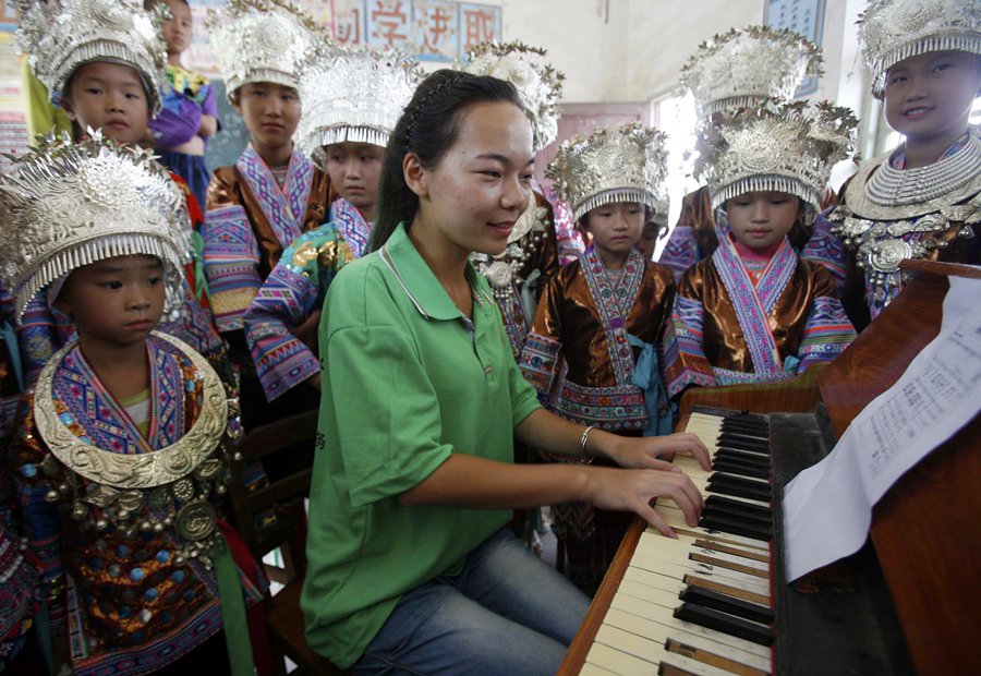Student from Anyang Normal University, central China's Henan Province, volunteers to come to Liudoumiao village of South China's Guangxi Zhuang Autonomous Region to give local pupils classes and accompany them in the summer vacation. (Photo/ Xinhua)