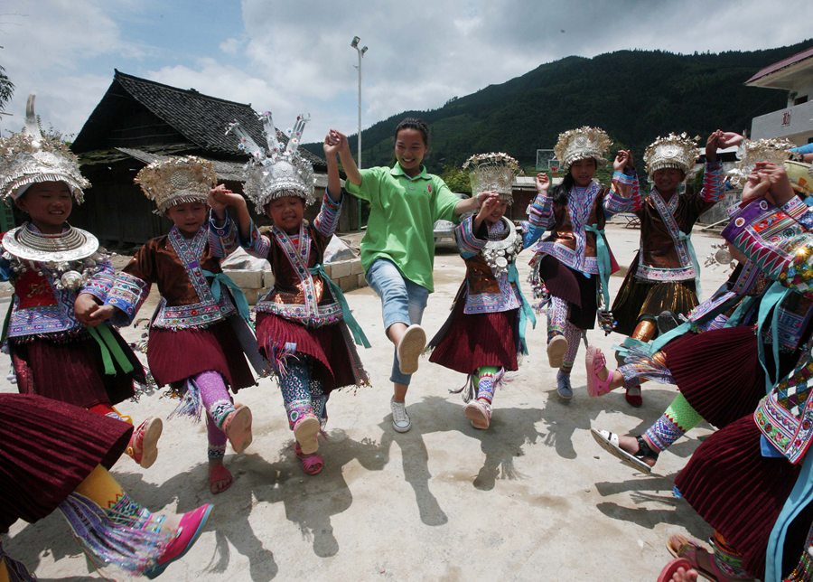 Student from Anyang Normal University, central China's Henan Province, volunteers to come to Liudoumiao village of South China's Guangxi Zhuang Autonomous Region to give local pupils classes and accompany them in the summer vacation. (Photo/ Xinhua)