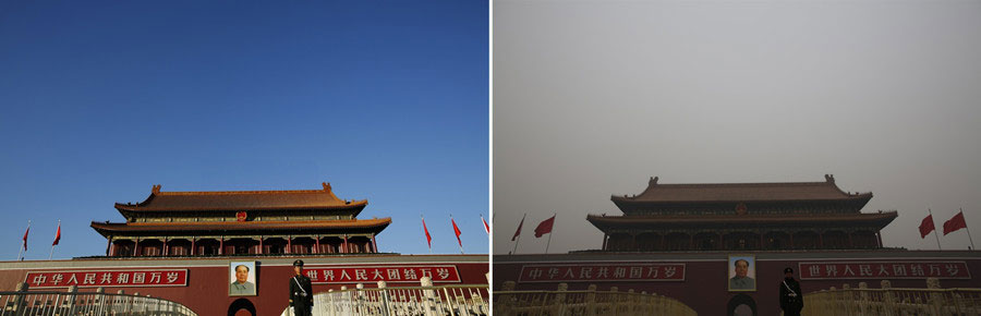 A combination picture shows the Tiananmen Gate on a sunny day (L) and a polluted day in Beijing. Pictures are taken on November 17, 2014 (L) and January 15, 2015 (R). Beijing has witnessed many beautiful blue skies during the APEC meeting last November thanks to the temporary "odd-even" traffic control. [Photo: Xinhua]