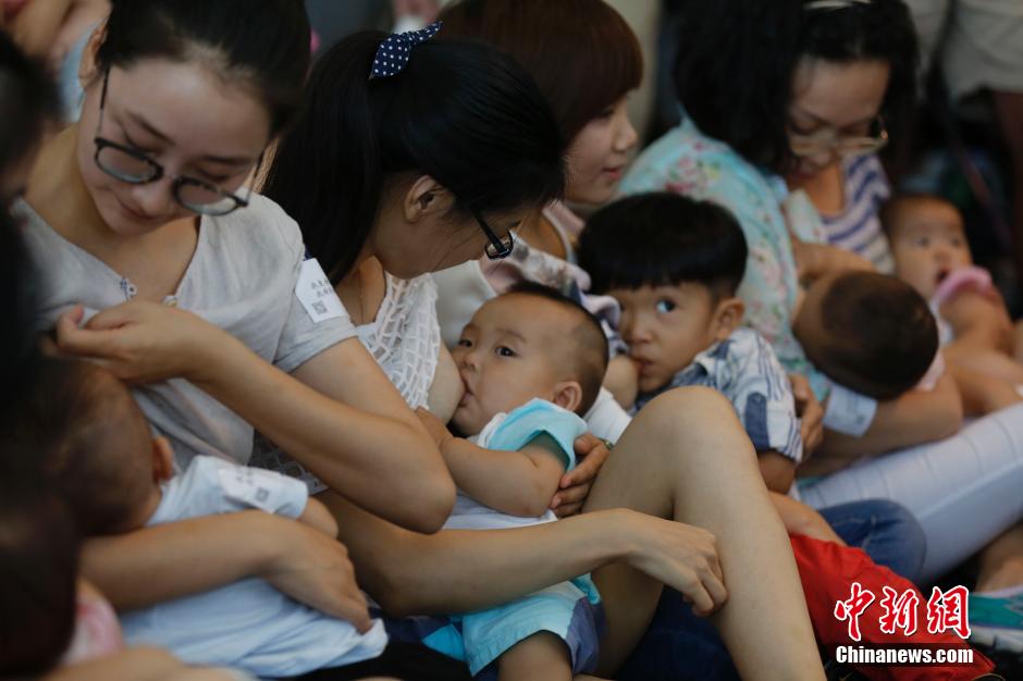 Eighty-eight mothers from China and all over the world stage a flash mob in Jinmao Tower in Shanghai, calling for public support for breastfeeding on Aug. 1, 2015. (CNS/Tang Junyi)