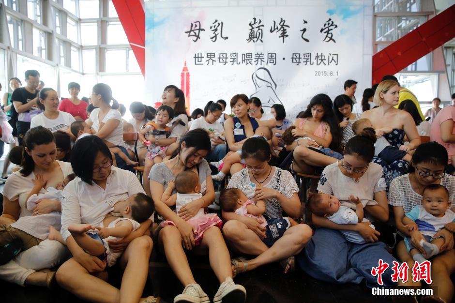 Eighty-eight mothers from China and all over the world stage a flash mob in Jinmao Tower in Shanghai, calling for public support for breastfeeding on Aug. 1, 2015. (CNS/Tang Junyi)