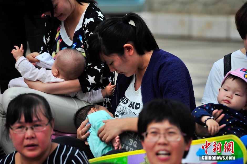 A flash mob of breastfeeding is staged in Xisi Square in Kunming, capital of southwest China's Yunnan province to call for public support for breastfeeding on Aug. 1, 2015. (CNS/Liu Ranyang)
