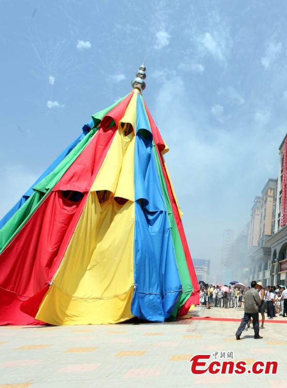 | An umbrella of 23 meters in diameter and 18 meters in height is certificated as the world's largest umbrella by Guinness World Records in Xingzi county, East China’s Jiangxi province, Aug 3, 2015. The umbrella weighs 5.7 tonnes and can cover an area of 418 square meters. A company invested 700,000 yuan($113,000) to build the umbrella in half a year. (Photo: China News Service/Wei Dongsheng) |