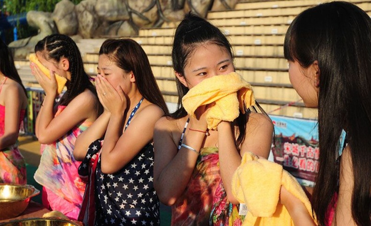 Ladies attending a matchmaking event remove their makeup in a water park in Hangzhou, Zhejiang province on Aug. 1, 2015. The event which encouraged women not to wear makeup attracted more than 30,000 singles. (Photo/ zjol.com.cn)