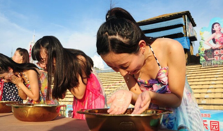 Ladies attending a matchmaking event remove their makeup in a water park in Hangzhou, Zhejiang province on Aug. 1, 2015. The event which encouraged women not to wear makeup attracted more than 30,000 singles. (Photo/ zjol.com.cn)