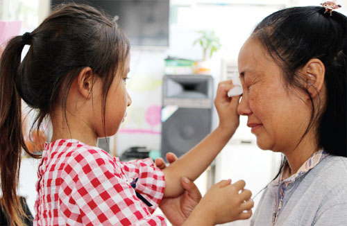 | Li Lijuan's 27th adopted child, 7-year-old Da Qiao, wipes tears from Li at their home in Shangquan village, Hebei province, in July. Zhang Yu / China Daily |