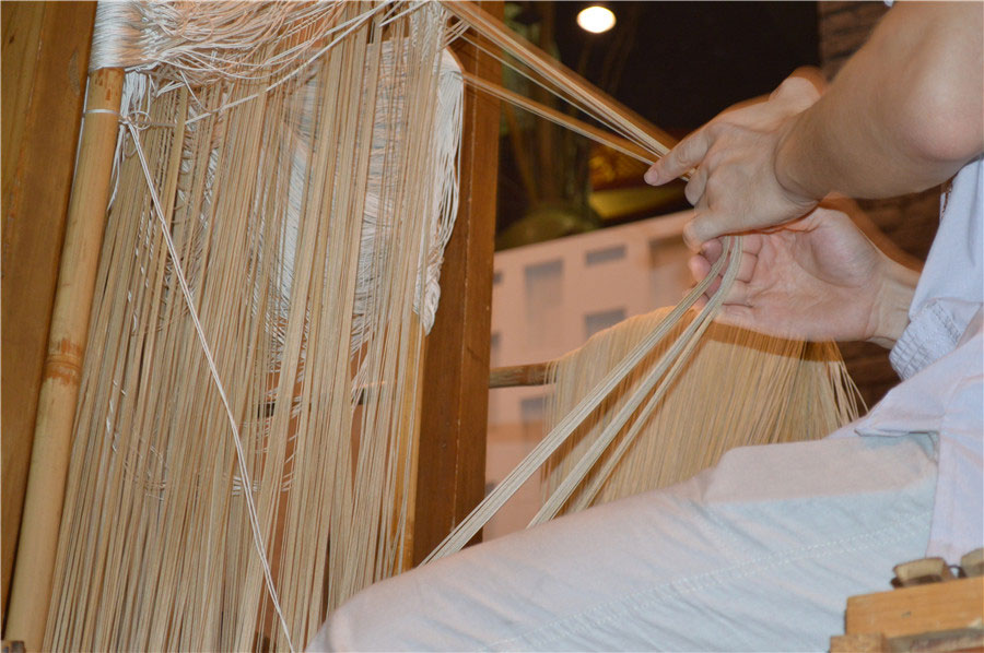 The person working on the top of the patterning tower loom is in charge of creating the pattern by pulling the threads.[Photo by Jiang Wanjuan/chinadaily.com.cn]