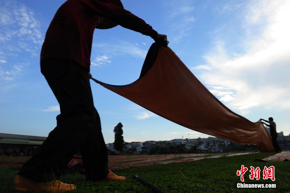 Workers dry the buttercup silk in the sun. (Photo/CNS)