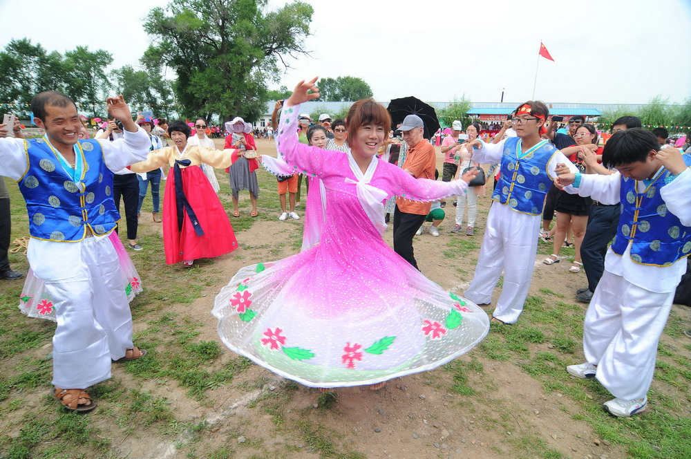 People of Korean nationality give performance in Jiangxi village of Bohai township, Heilongjiang province on July 30, 2015.