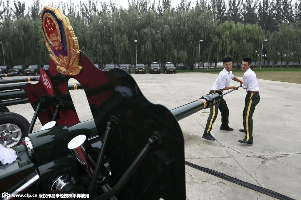 | Dozens of guns appear in a drill field in Beijing on Aug. 1, 2015. An armed police force unit responsible for providing gun salutes is in active preparation for the upcoming military parade of the 70th Anniversary of the Victory of the Chinese People’s War of Resistance Against Japanese Aggression and the World Anti-fascist War. (Photo/CFP) |