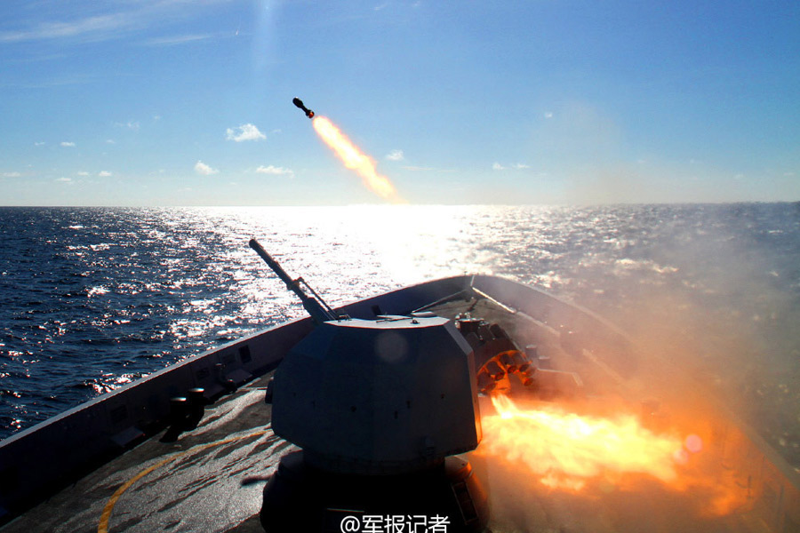 A destroyer branch of the PLA Navy’s South China Sea Fleet conducts live fire exercise recently, firing dozens of guided missiles and torpedoes. (Photo/official website of PLA Daily)