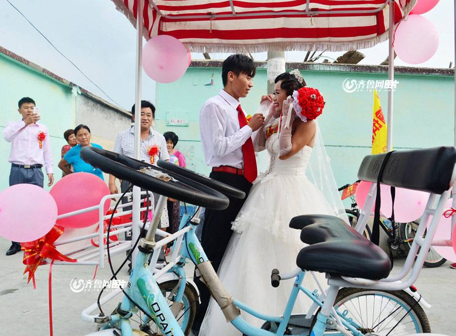 Cycling enthusiast Liu Zhaohui, accompanied by over 60 friends from his cycling club, rides 26 km to fetch his bride Zhang Ningning in Liaocheng, east China’s Shandong province on Aug. 3, 2015. The couple got acquainted in the cycling club, and they chose to have a “l(fā)ow carbon wedding” through riding. (Photo/iqilu.com)