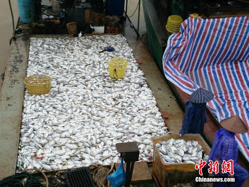 3,426 tons of gold pomfrets die in a heavy storm which lasted for several days in Qinzhou, southwest China's Guangxi, which has causes a direct economic loss of 75 million yuan. Currently, the dead fishes have basically been salvaged, and the disaster relief work by local government is underway. (CNS/Li Qiteng)