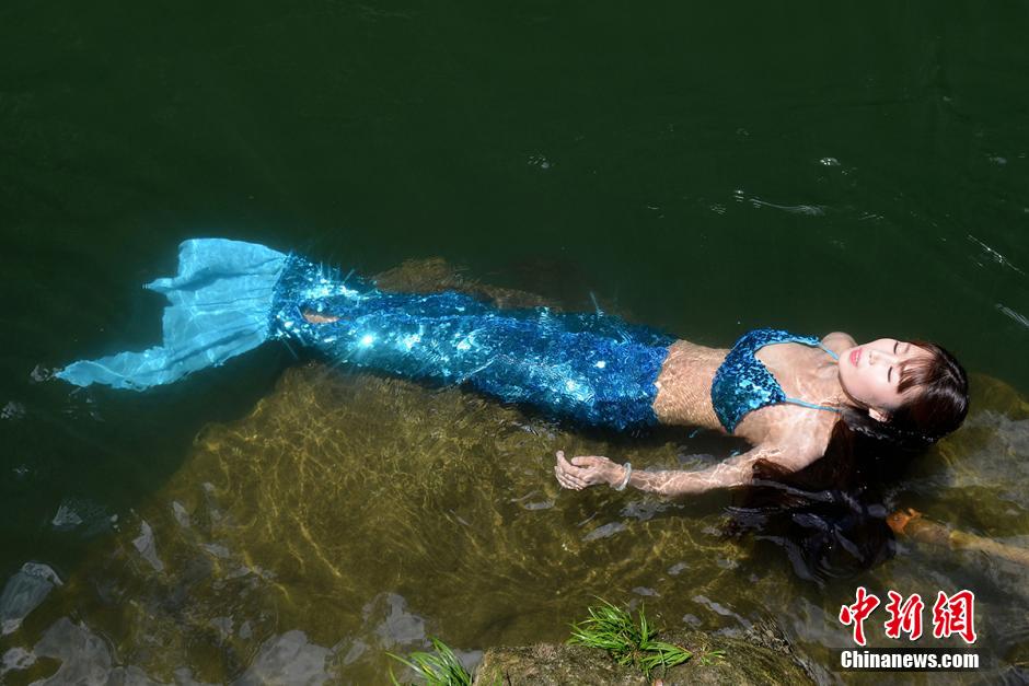 A “mermaid” rests on the stone. (Photo from Chinanews)