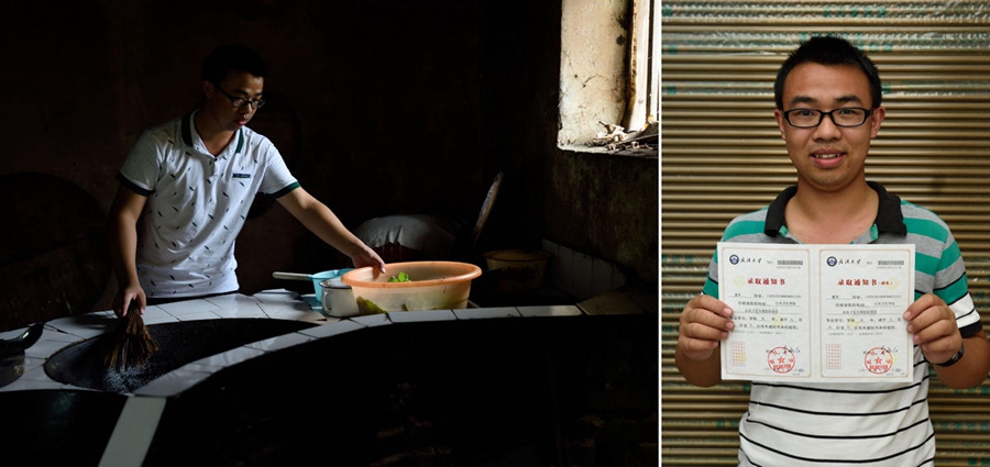 Xia Jun does chores at home. Xia Jun shows his letter of admission from Wuhan University. (Xinhua/Fan Junwei)
