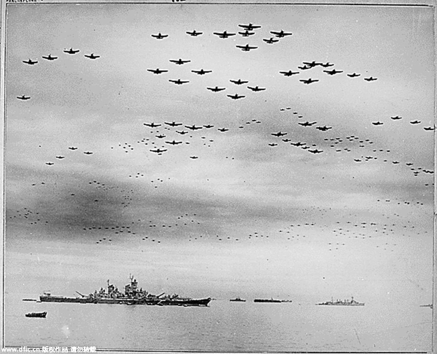 US Corsairs and Grumman F6F Hellcats hover in the sky above the USS Missouri where Japan signed the instrument of surrender. (Photo/DFIC)