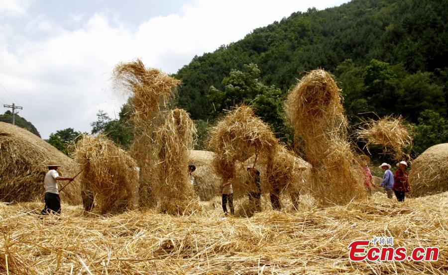 Farmers harvest wheat using traditional ways in Qingshui county, Northwest China’s Gansu province. In the mountainous region, farmers cannot use harvesting equipment due to the poor traffic infrastructure and have to harvest wheat manually. (Photo: China News Service/Lei Jinfeng)