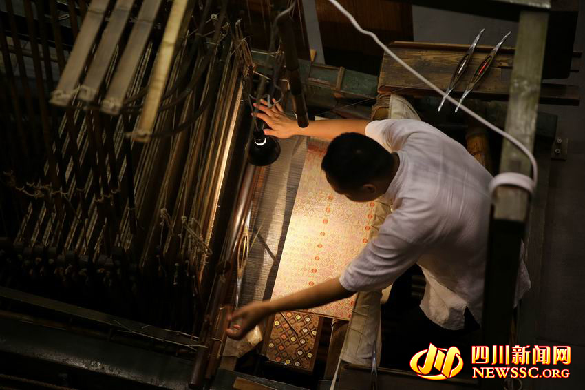 Inheritors of Sichuan brocade handcraft show visitors the whole process of making the brocade on the traditional weaving machine in Sichuan Brocade Museum on Aug. 3, 2015. One of the weaving machines they use is passed down from Qing Dynasty (1636-1912). (Photo/NEWSSC.ORG)