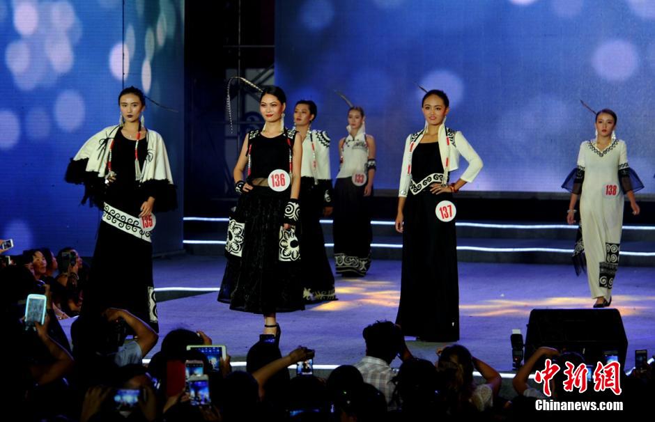 Models show beautiful costumes of the Yi nationality on T stage. (Photo by China News Agency/ Liu Zhongjun)