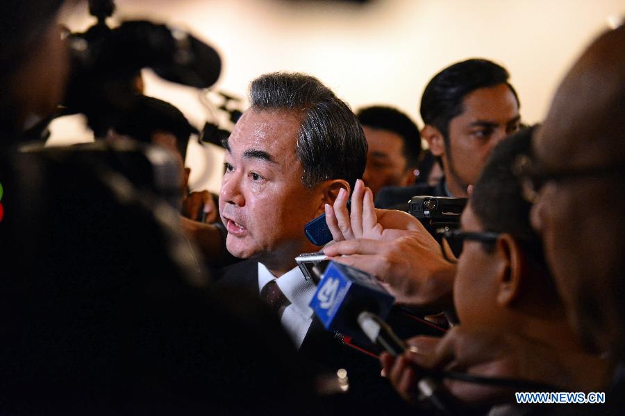 Chinese Foreign Minister Wang Yi (C) speaks to the media during the East Asia Summit Foreign Ministers' Meeting in Kuala Lumpur, Malaysia, on Aug. 6, 2015. (Xinhua/Chong Voon Chung)
