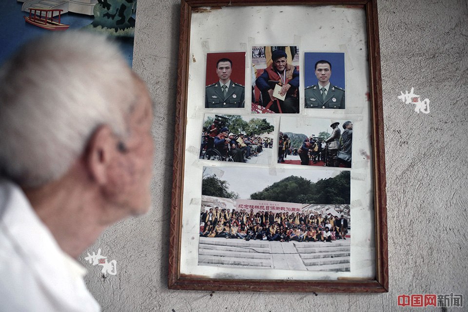 Qin hangs photos on the wall. His grandson, son in law are all soldiers. (China.com.cn/Liu Jiaoqing)