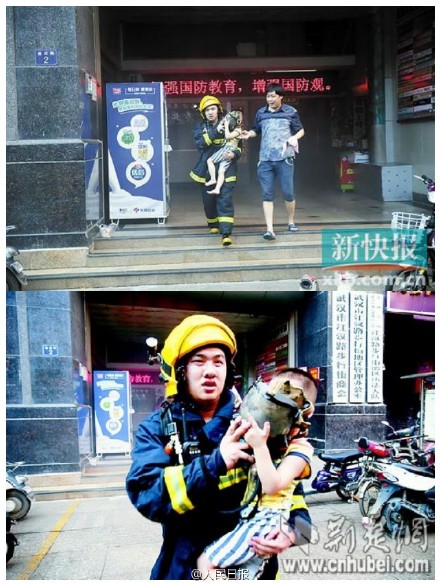 During the fire that broke out in a building in Wuhan on July 29, 2015, fireman Du Qiang found Pan Wen and his 3-year-old son trapped on the 22th floor. Du rescued them out of the fire and gave his gas mask to Pan Wen's son.