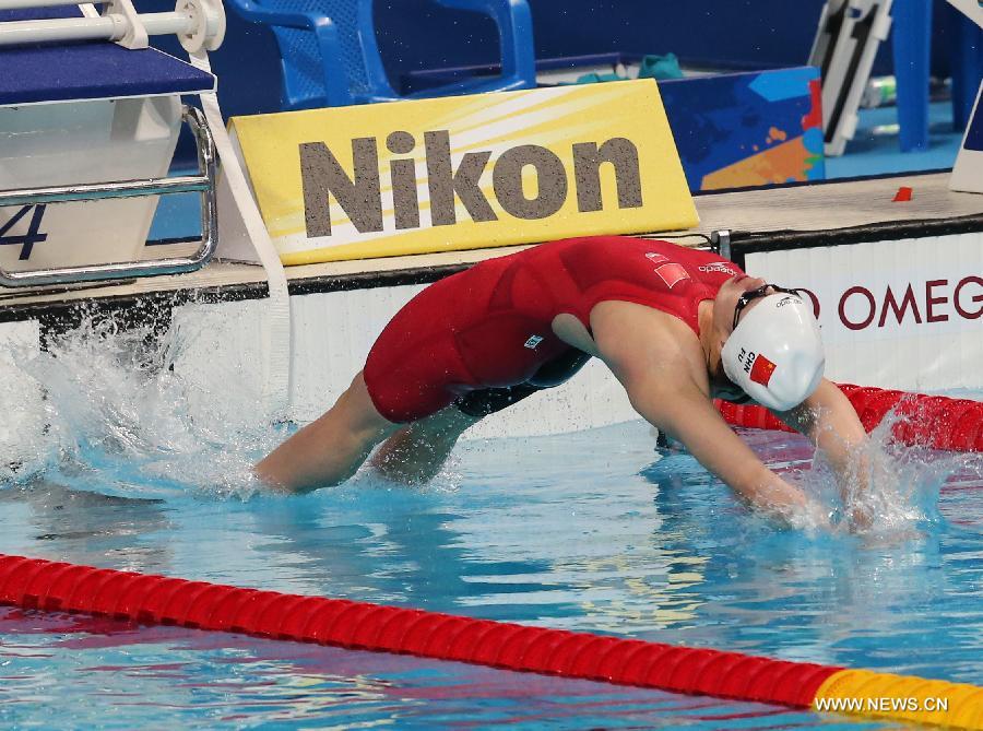 Fu Yuanhui of China dives during the women's 50m backstroke final at the 2015 FINA World Championships in Kazan, Russia, Aug. 6, 2015. Fu claimed the title with 27.11 seconds. (Xinhua/Meng Yongmin)