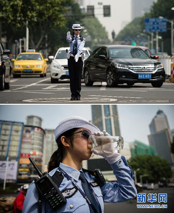 On July 15, Bo Xue is on duty at an intersection in South Nanjing. (Photo from Xinhua)