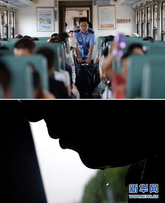 In mid-July, the temperature of Xi’an and other regions reaches 39 degrees Celsius. Gao Lei, a crew member on Train 7005/6 of Xi’an Railway, works to fetch water, coal the train and clean the boiler ash. He is responsible for three water boilers, providing more than 50 tanks of boiled water for 11 compartments. He is busy and sweating in maintaining water supply for passengers.