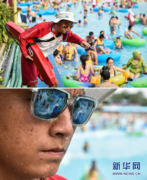 On July 15, life guard Dai Ribin was reminding tourists of safety. (Photo from Xinhua)