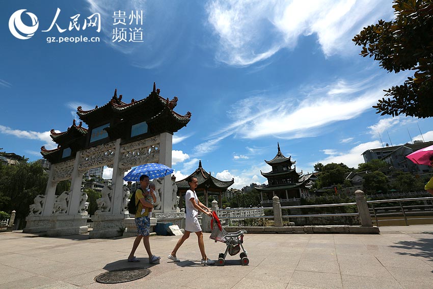 Tourists gather at the Jiaxiu Pavilion and enjoy the cool summer in Guiyang city. (People's Daily Online/Shi Kaiyin)