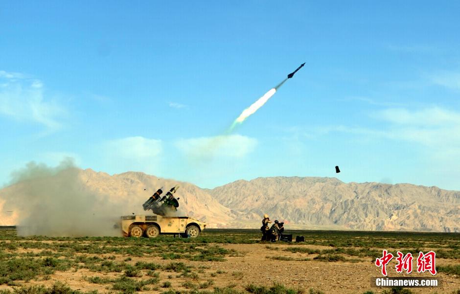 An antiaircraft artillery regiment of the 54th Group Army of the PLA conducts live fire training in desert in August 2015. (Photo/CNS)