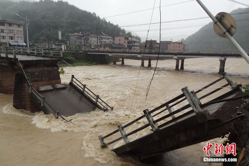 Typhoon Soudelor, the 13th this year, has left 14 people dead in the eastern Chinese cities of Wenzhou and Lishui, where heavy rains triggered mudslides and caused a bridge to collapse. (CNS/ Lin Yichi)