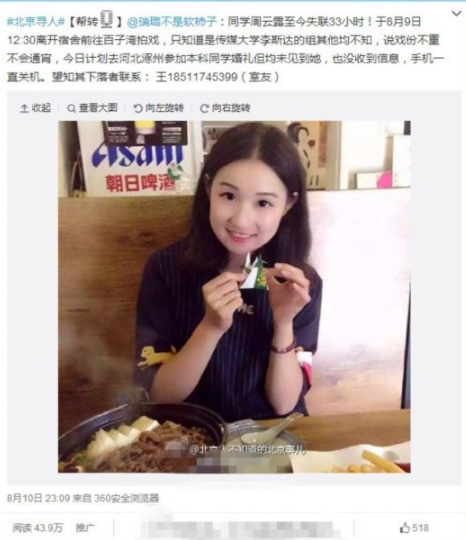 A WeChat message saying she was missing spread among students and users. The message identified her as Zhou Yunlu, who majored in acting and was in the second year of her graduate studies before her death.