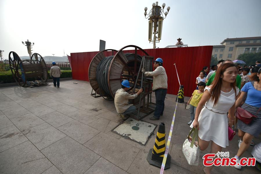 Workers build temporary platforms for people to watch a military parade from on September 3 on the flanks of Tiananmen Tower at the north of Tiananmen Square in Beijing, Aug 11, 2015. The tower is closed as an entrance to the Forbidden City during construction. China is marking the 70th anniversary of victory in the Chinese People's War of Resistance Against Japanese Aggression (1937-1945). (Photo: China News Service/Jin Shuo)